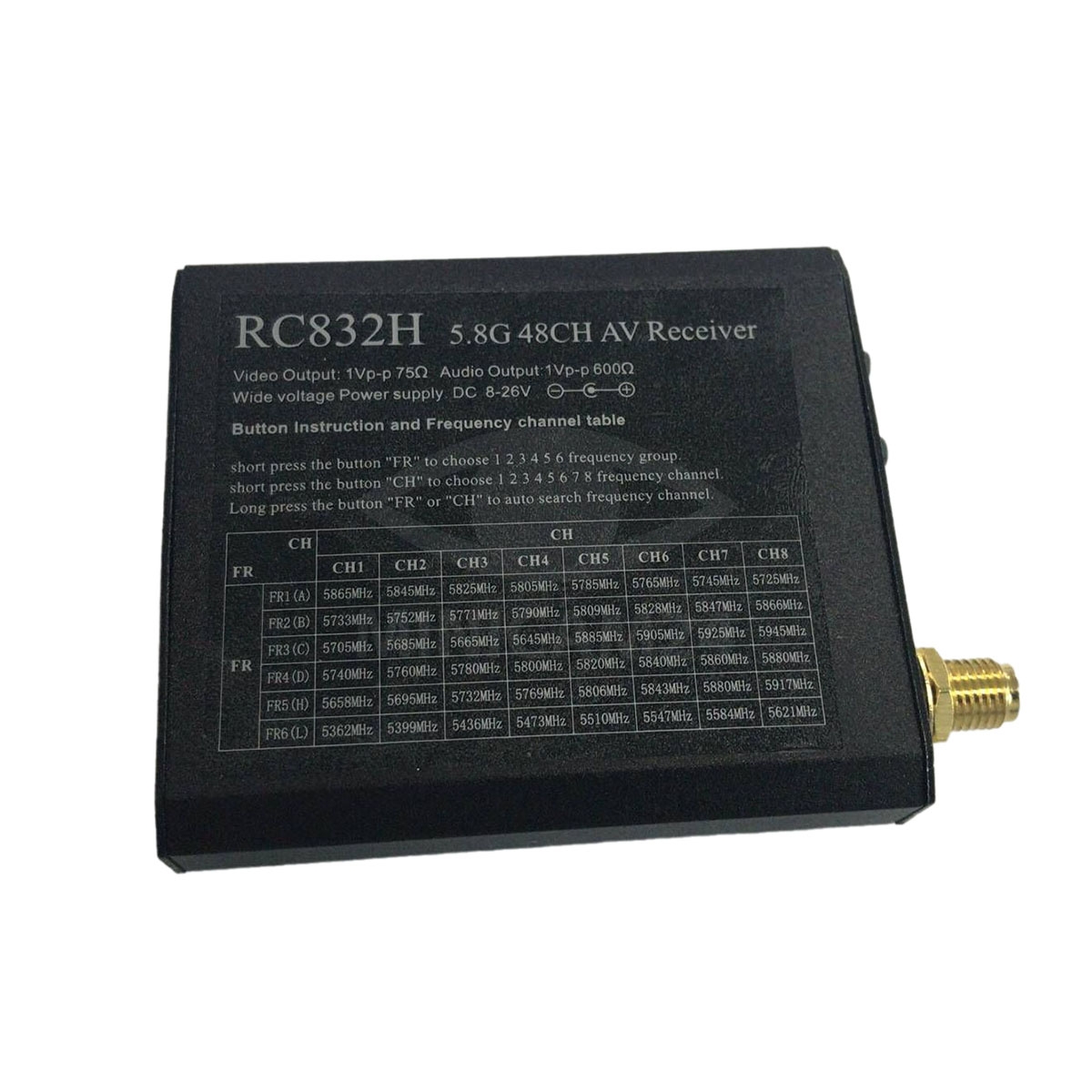 Устройство обладает компактными размерами (62х52х12 мм) и весит всего 50 г, что упрощает его установку и транспортировку. Антенный разъем RPSMA обеспечивает надежное подключение к антенне, позволяя поддерживать уверенный прием даже в условиях сложного рельефа или городской среды. Рабочее напряжение видеоприемника составляет 8-26 В, а ток питания — 120 мА, что делает его совместимым с большинством современных FPV-систем.